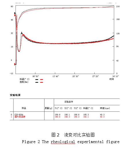 復(fù)配好的CZX-928A與進口某與品牌型材穩(wěn)定劑流變對比如圖2,塑化效果更好。